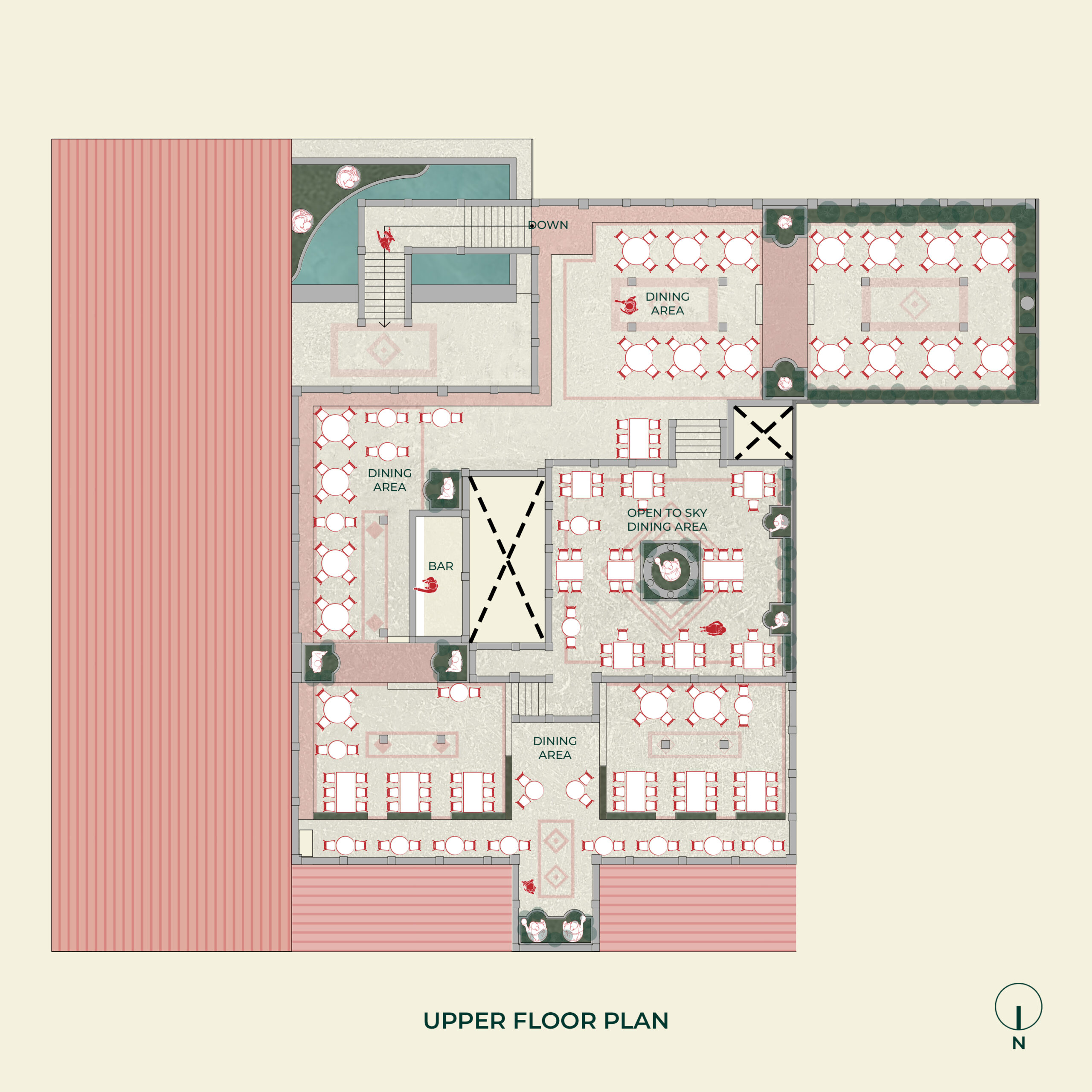 With Bengaluru’s highest microbrewery as its backdrop, enclosed in arches with a glass facade to give guests a view of the brewing process, the dining area has columns, Roman statues, and lush greenery. With the dining areas split across two levels, a water body at the entrance with a staircase rising over it gives an expansive view of the city as you go higher up the staircase to access the upper dining area. The kitchen and services were tucked away at the rear, away from the dining area, to ensure minimal interference in the overall experience for the patrons.