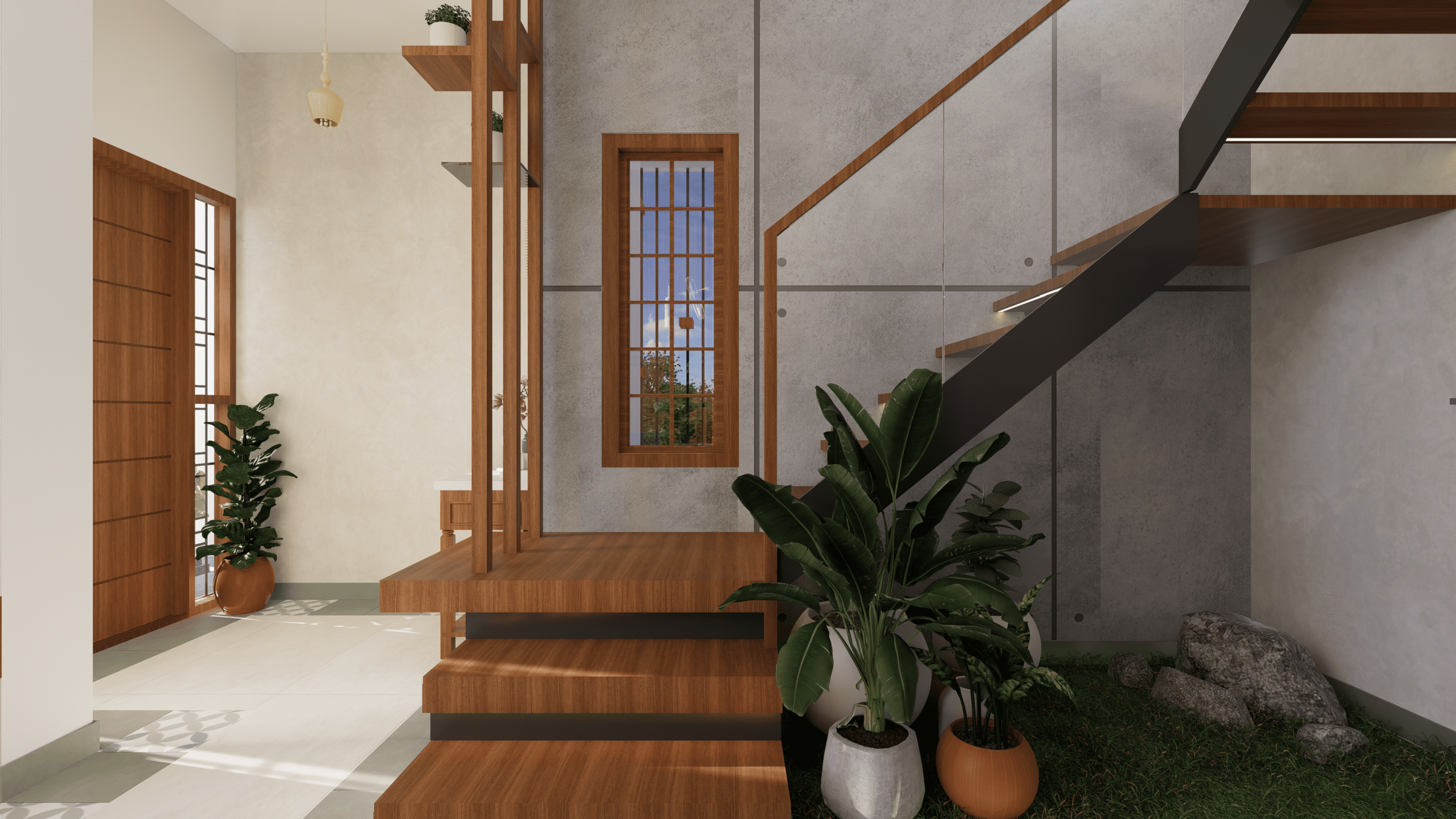 The interiors exude a modern yet luxurious aesthetic, achieved through a refined material selection. Wood-textured laminates add warmth, while printed tiles introduce character and intricate detailing. Fluted glass enhances light diffusion and creates a subtle interplay between transparency and privacy. Brass accents lend a timeless elegance, while marble flooring grounds the design with its opulent and polished appeal.